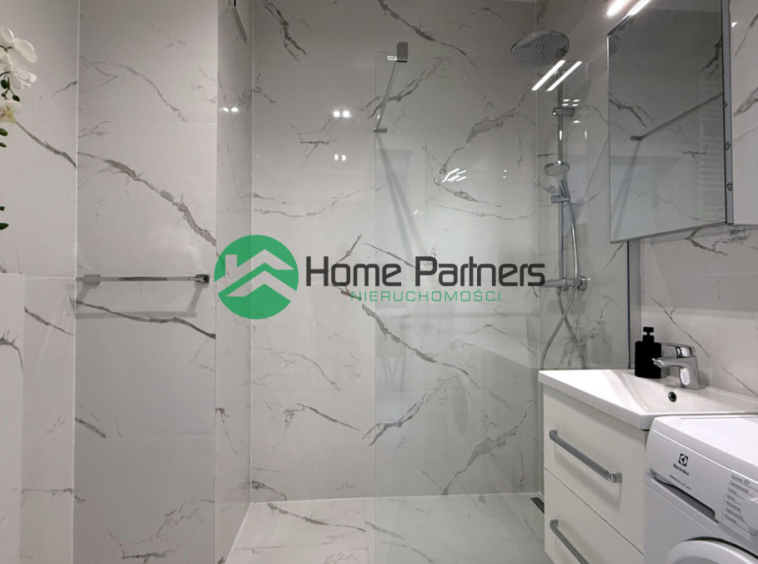 Łazienka: Nowoczesny prysznic i pralka.