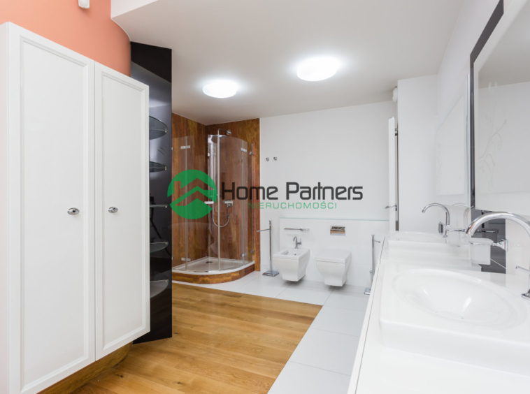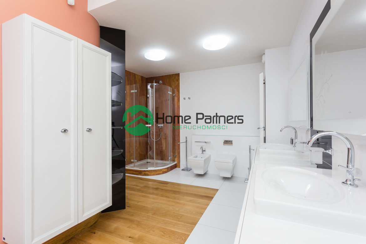 * sypialnia główna (19 m2) z garderobą oraz łazienką wyposażoną w wannę, prysznic i dwie umywalki ,